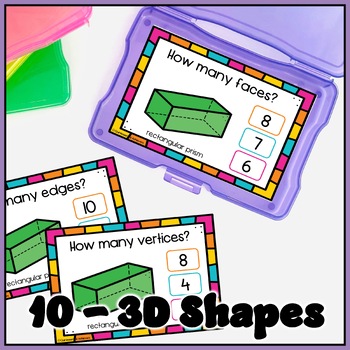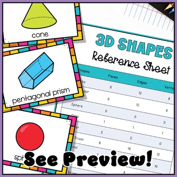 Use these 3D Shapes and Their Attributes Task Cards to help your kindergarten students with identifying basic 3D shapes and counting how the edges, faces and vertices solids. It comes with a 3D shapes reference guide and flash cards.