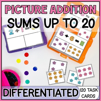 Differentiated Addition with Pictures Task Cards Within 20 to help your kindergarten and special education students with adding using visual models. Build counting and single digit addition skills with these Picture AdditionTask Cards for sums within 10 and 20.