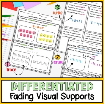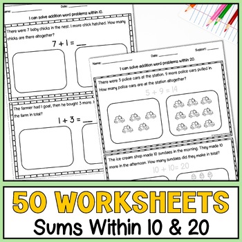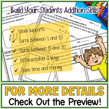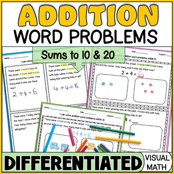 Use these differentiated addition word problems to 10 and 20 worksheets with 3 levels of differentiation – including visual supports to help your students solve the same addition word problems . Designed for K–2 and special ed, these 50 no-prep worksheets, you can meet diverse learning needs without planning multiple lessons.