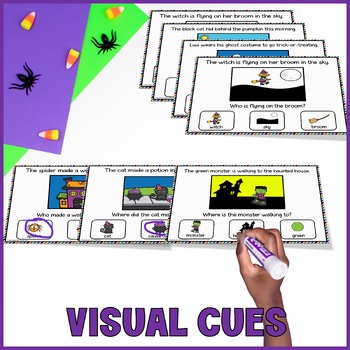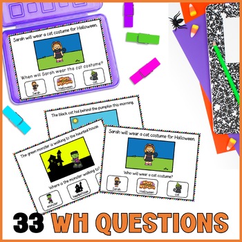 Do your students mix up Wh Questions who, what, where, and when? These Halloween Sentence Comprehension with Visuals Task Cards & Power Point make WH questions practice engaging, structured, and effective!