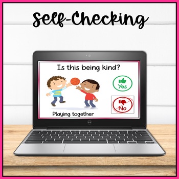 Help your students recognize kind and unkind behaviors with these interactive, NO-PREP social emotional Boom Cards™! Perfect for digital learning, small groups, independent work or morning meetings.Students will determine if the behavior shown is being kind by choosing YES or NO options.