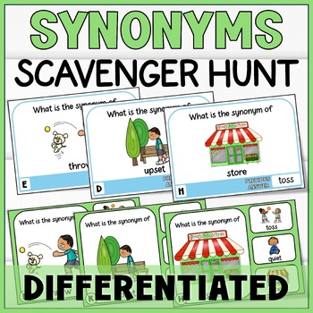 Incorporate some movement in your next vocabulary lesson with this Differentiated Synonyms Scavenger Hunt with Visuals activity! Get your students identifying synonyms and learning new words with this engaging synonyms activity with pictures.