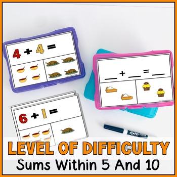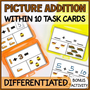 Ta da! Differentiated Thanksgiving Picture Addition Within 10 Task Cards with three differentiated levels and bonus addition worksheets. This adding with pictures activity is designed to help your students build addition fluency and number sense in a hands-on, visual way. It’s easy to meet every student where they are!
