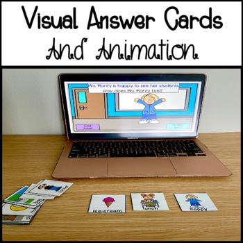 Each WH question has an easy-to-read sentence describing an animated GIF picture. The WH questions in this digital resource bundle include what? who? when? where and how? Use the picture answer cards for students to point from field of 3 or 4 options. Or get students to write their WH question answers d