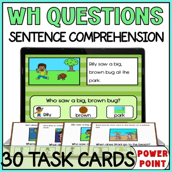 Help your students master sentence comprehension and Wh- questions (what, where, who, when) with these engaging task cards with visuals! This resource includes short, simple sentences with picture supports, multiple formats (task cards & PowerPoint), and are ready-to-use activities for small group, centers, or whole class instruction. Designed for special education, emerging readers, and ELL students,